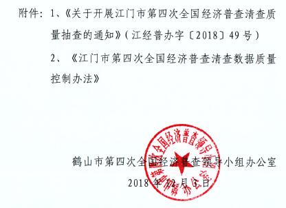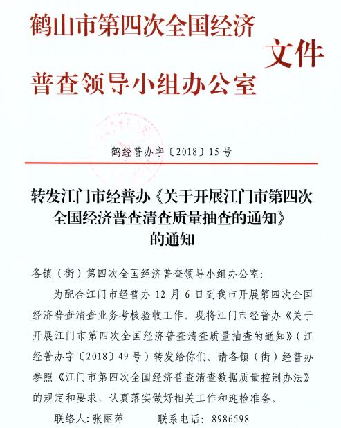 轉發(fā)江門市經(jīng)普辦《關于開展江門市第四次全國經(jīng)濟普查清查質量抽查的通知》的通知