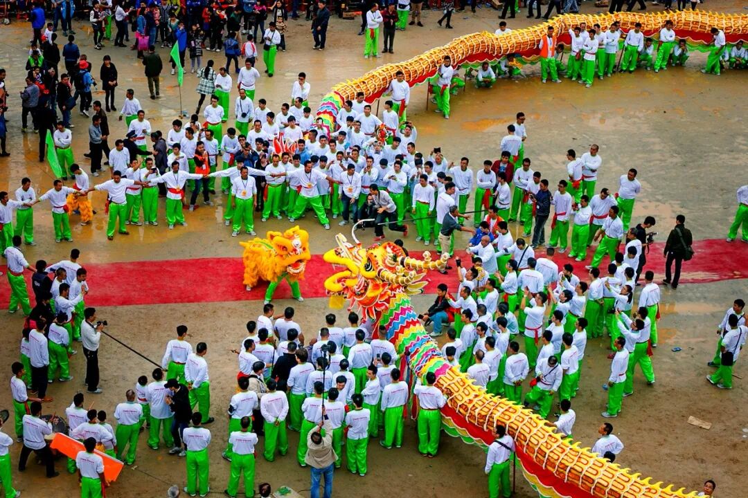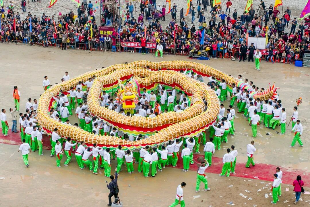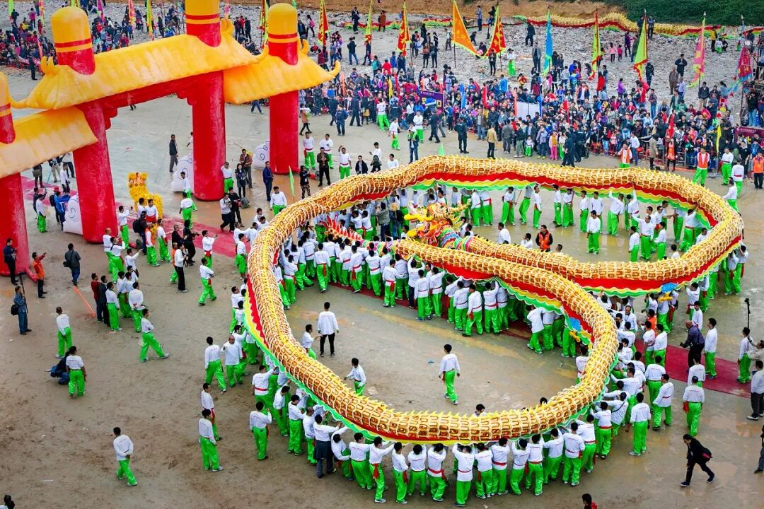 竹朗金龍從龍頭到龍尾都用金黃色飾物,故稱“金龍”,全長約78米,龍頭龍尾各重五六十斤,要?jiǎng)佑?00多人才能舞動。