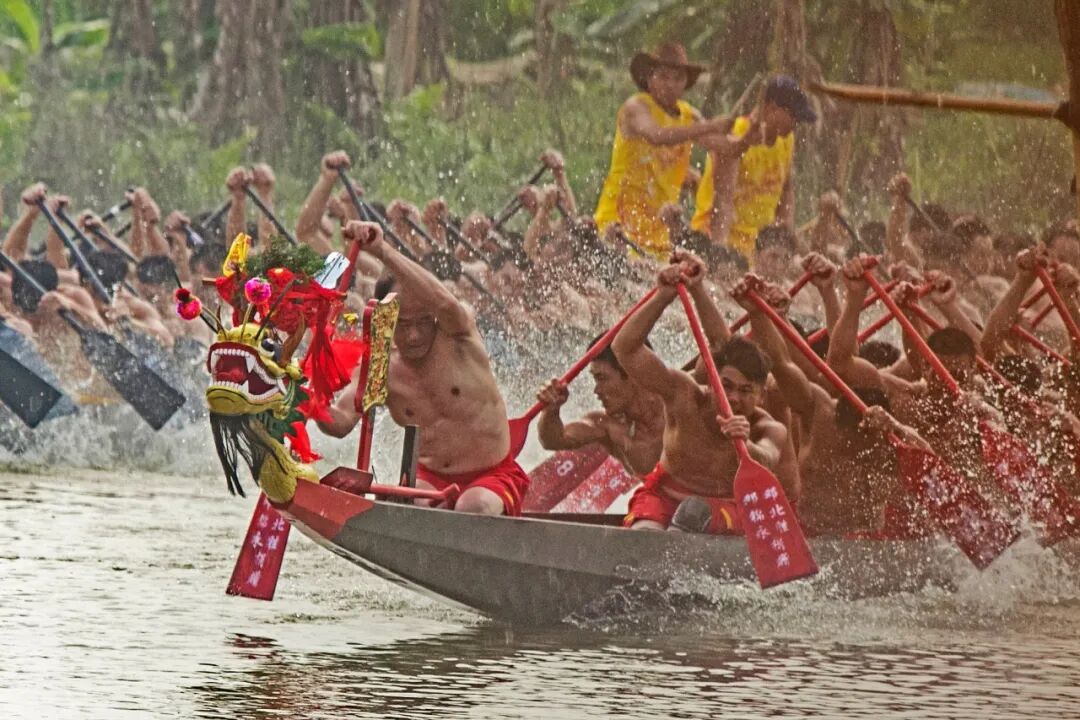 比賽時,“扒丁”握槳而坐,以鼓聲為令,數拾支槳整齊劃一地飛動,龍舟疾進,如離弦之箭,兩岸鑼鼓喧天,場面異常激烈。