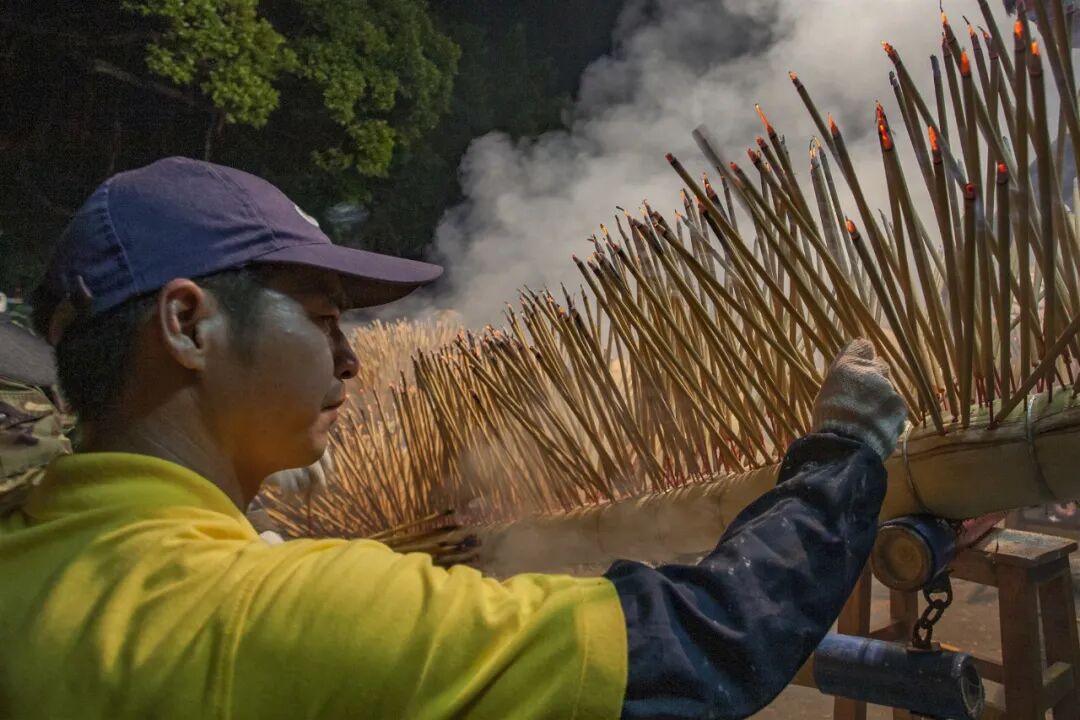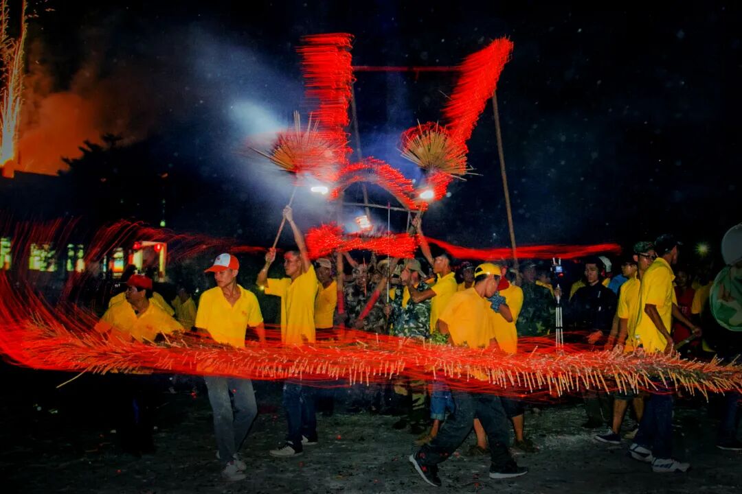 龍分龍頭、龍身、龍尾三個部分,龍頭龍尾先用大竹扎成骨架,高約5米,骨架外再用山草和蕉樹皮等包扎,以便插香。龍身以麻繩、鐵線作為龍筋,用樹枝葉扎成,每隔1.5米分成一節(jié),用竹竿或樹干支撐扎牢,供舞龍者操持,節(jié)節(jié)相連,節(jié)節(jié)活動,通??傞L約80-100米,可據(jù)舞龍人數(shù)多少增減節(jié)數(shù)。舞龍頭、龍尾各用十多人,龍身每節(jié)一人。龍身扎成時,白天看樣子不甚起眼,可是晚上舞龍時渾身插上千萬支香火,星星點點的火頭就呈現(xiàn)出巨大滾圓的龍身,形象非常壯觀。