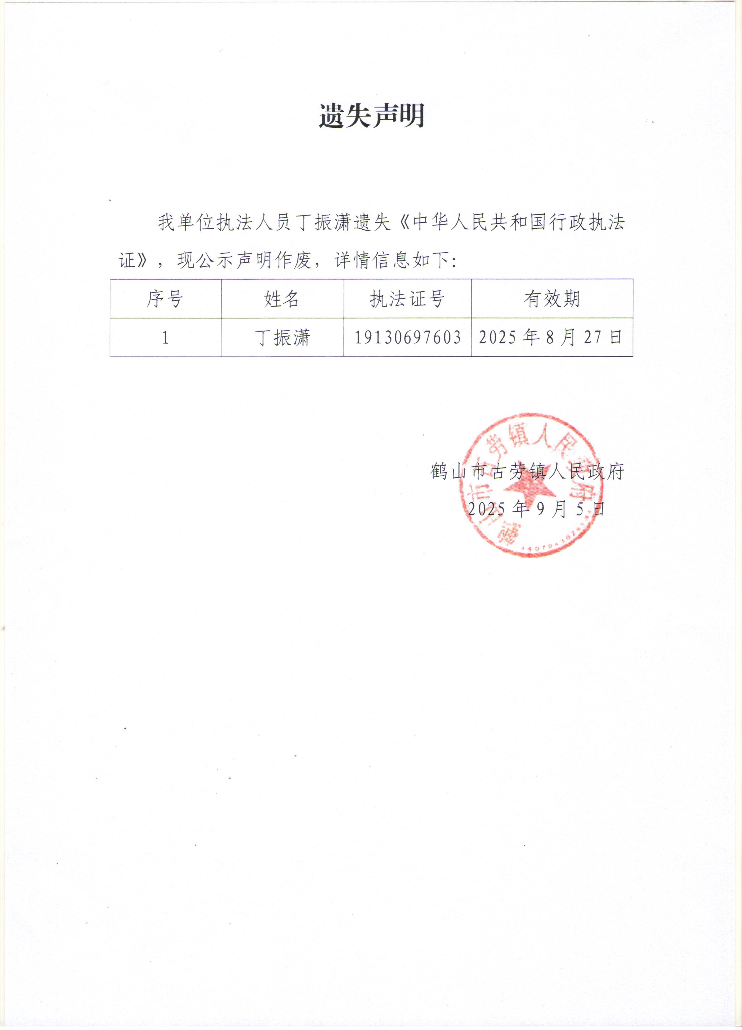 茲有我鎮(zhèn)執(zhí)法人員所持《中華人民共和國(guó)行政執(zhí)法證》不慎遺失,現(xiàn)聲明作廢。