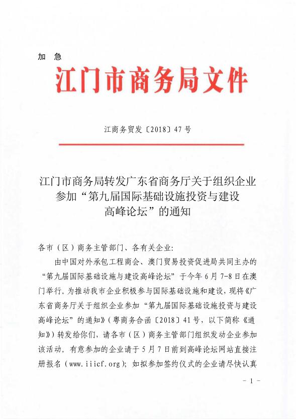 江門(mén)市商務(wù)局轉(zhuǎn)發(fā)廣東省商務(wù)廳關(guān)于組織企業(yè)參加“第九屆國(guó)際基礎(chǔ)設(shè)施投資與建設(shè)高峰論壇“的通知