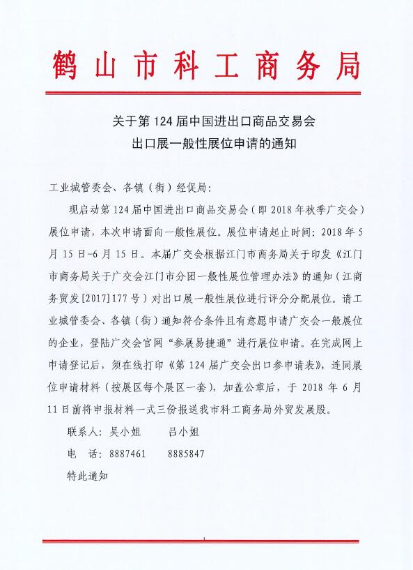 關(guān)于第124屆中國進(jìn)出口商品交易會出口展一般性展位申請的通知
