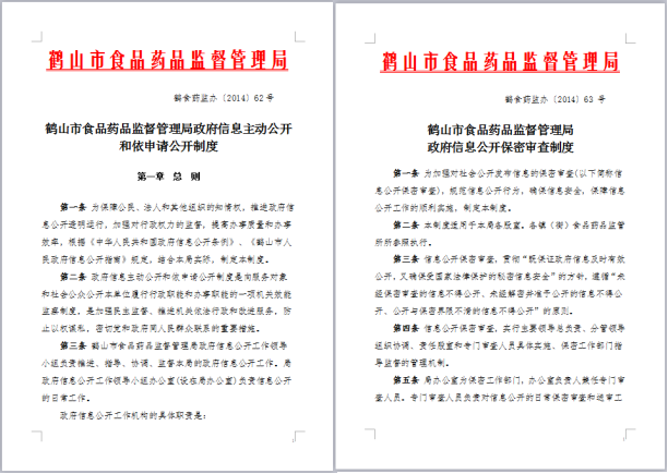 圖2-3:《鶴山市食品藥品監(jiān)督管理局政府信息主動公開和依申請公開制度》、《鶴山市食品藥品監(jiān)督管理局政府信息公開保密審查制度》