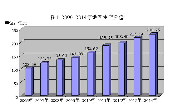 初步核算,2014年全市地區(qū)生產(chǎn)總值230.76億元,增長6.9%。分產(chǎn)業(yè)看,第一產(chǎn)業(yè)增加值16.87億元,增長3.9%;第二產(chǎn)業(yè)增加值126.81億元,增長9.6%;第三產(chǎn)業(yè)增加值87.09億元,增長3.2%。三大產(chǎn)業(yè)的比例是7.3:55:37.7。人均地區(qū)生產(chǎn)總值46088元,增長5.7%。全社會用電量為30.11億千瓦時,增長10.0%,其中城鎮(zhèn)居民用電14160萬千瓦時,增長7.6%,農(nóng)村居民用電14288萬千瓦時,增長9.5%。