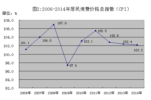 全年居民消費價格總指數(shù)為102.2,上漲2.2%。 分類別看,食品類價格上漲4.3%,煙酒類價格上漲0.9%,衣著類上漲1.0%,家庭設(shè)備用品及維修服務(wù)類上漲0.7%,醫(yī)療保健和個人用品上漲2.5%,交通及通信下降1.2%,娛樂教育文化用品及服務(wù)上漲2.4%,居住類上漲0.2%。