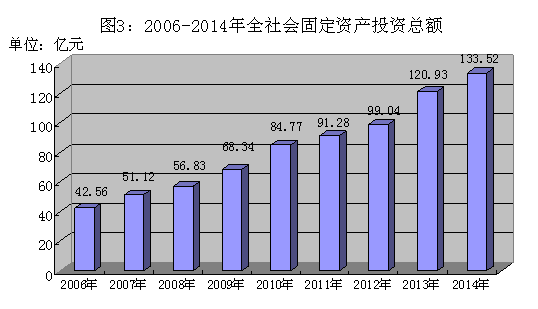 2014年固定資產(chǎn)投資133.52億元,增長15.0%。按投資結(jié)構(gòu)分,基礎(chǔ)設(shè)施投資27.00億元,下降41.6%;房地產(chǎn)投資50.59億元,增長60.1%;其他投資55.93億元,增長46.1%;。按產(chǎn)業(yè)分,第一產(chǎn)業(yè)投資1.36億元;第二產(chǎn)業(yè)投資49.23億元,下降28.0%,其中制造業(yè)投資42.72億元,增長34.3%;第三產(chǎn)業(yè)投資82.94億元,同比增長75.5%。