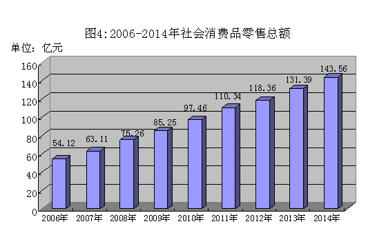 2014年全市實現(xiàn)社會消費品零售總額143.56億元,增長9.3%。按行業(yè)分,貿(mào)易批發(fā)業(yè)零售額11.80億元,增長8.9%;貿(mào)易零售業(yè)108.42億元,增長9.4%,以上兩者占全市社會消費品零售總額的83.7%;住宿業(yè)零售額0.61億元,下降2.2%;餐飲業(yè)零售額22.73億元,增長8.9%。按所在地分,城市消費品市場零售額87.67億元,增長9.8%;農(nóng)村消費品市場零售額55.89億元,增長8.4%。