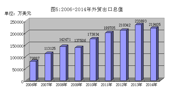 2014年全市外貿(mào)出口總值21.94億美元,下降6.2%。按貿(mào)易性質(zhì)分,一般貿(mào)易出口9.92億美元,下降9.0%;加工貿(mào)易出口12.02億美元,下降3.7%。按企業(yè)性質(zhì)分,民營企業(yè)出口6.70億美元,下降5.7%;三資企業(yè)出口15.24億美元,下降6.4%。主要出口商品中,機電產(chǎn)品出口總值9.62億美元,下降12.2%;印刷品出口總值3.77億美元,增長7.4%;紡織品出口總值2.86億美元,下降14.9%;鞋類出口總值0.61億美元,下降36.3%。主要出口地區(qū)中,美國出口總值5.36億美元,下降3.9%;歐盟出口總值5.05億美元,增長4.0%;香港出口總值4.41億美元,下降9.9%。全年外貿(mào)進口總值4.09億美元,下降8.7%。