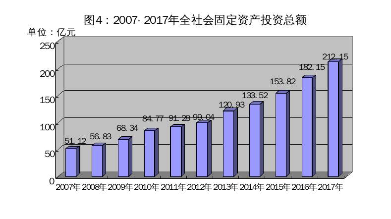 2017年固定資產(chǎn)投資完成212.15億元,增長16.5%,其中基礎設施42億元,下降7.1%;房地產(chǎn)開發(fā)51.18億元,增長32.7%;其他投資118.97億元,增長20.9%。按產(chǎn)業(yè)分,第一產(chǎn)業(yè)投資1.46億元;第二產(chǎn)業(yè)完成投資116.05億元,增長29.3%;第三產(chǎn)業(yè)完成投資94.64億元,增長3.3%。
