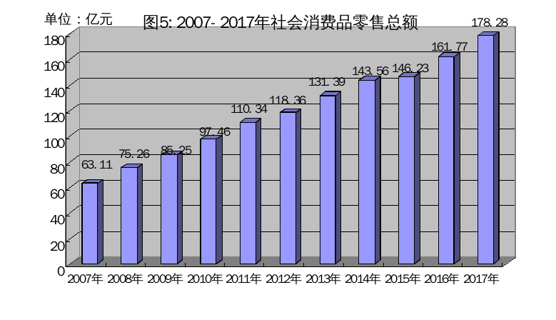 2017年全市實現(xiàn)社會消費品零售總額178.28億元,增長10.2%。按行業(yè)分,貿(mào)易批發(fā)業(yè)零售額17.30億元,增長14.5%;貿(mào)易零售業(yè)133.41億元,增長10.5%,以上兩者占全市社會消費品零售總額的84.5%;住宿業(yè)零售額0.91億元,增長21.5%;餐飲業(yè)零售額26.61億元,增長5.5%。