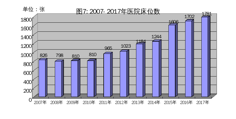 全市有醫(yī)院、衛(wèi)生院15間;衛(wèi)生機構床位1781張,衛(wèi)生機構人員數(shù)3192人,衛(wèi)生技術人員有2842人,其中:執(zhí)業(yè)醫(yī)師548人,執(zhí)業(yè)助理醫(yī)師190人,注冊護士1129人,藥劑人員229人,檢驗人員103人。全市衛(wèi)生站140個,衛(wèi)生站總人數(shù)190人。