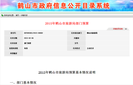 (四)做好預算信息公開工作。為進一步提高政府預算透明度,推進政府預算信息公開工作,2015年2月,我局在門戶網(wǎng)站上公開了政府預算信息《鶴山市旅游局2015年部門預算》。