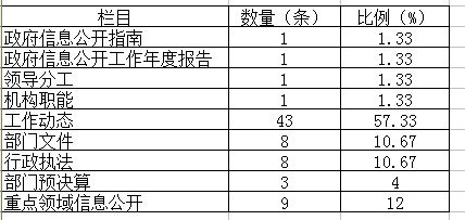 (一)在我局部門網(wǎng)站主動公開政府信息情況。2018年1月至12月,我局部門網(wǎng)站發(fā)布信息75條,其中政府信息公開指南1條,占1.33%,政府信息公開工作年度報告1條,占1.33%,領導分工1條,占1.33%,機構(gòu)職能1條,占1.33%,工作動態(tài)43條,占57.33%,部門文件8條,占10.67%,行政執(zhí)法8條,占10.67%,部門預決算3條,占4%,重點領域信息公開類9條,占12%。