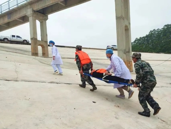 演練模擬因持續(xù)強(qiáng)降雨造成水庫、河道水位快速上漲,有群眾受困。鎮(zhèn)三防指揮部接獲上沙村委會水情、雨情和人員受困險(xiǎn)情報(bào)告后,立即啟用應(yīng)急預(yù)案,召集鎮(zhèn)綜合應(yīng)急救援隊(duì)、民兵等迅速攜帶沖鋒舟、抽水泵、救生衣、救生圈、醫(yī)療物資等趕往現(xiàn)場支援。