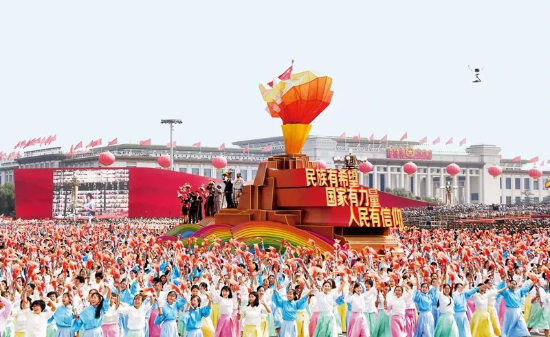 2019年10月1日,慶祝中華人民共和國成立70周年大會在北京天安門廣場隆重舉行。這是群眾游行中的“凝心鑄魂”方陣。 新華社記者 李欣/攝